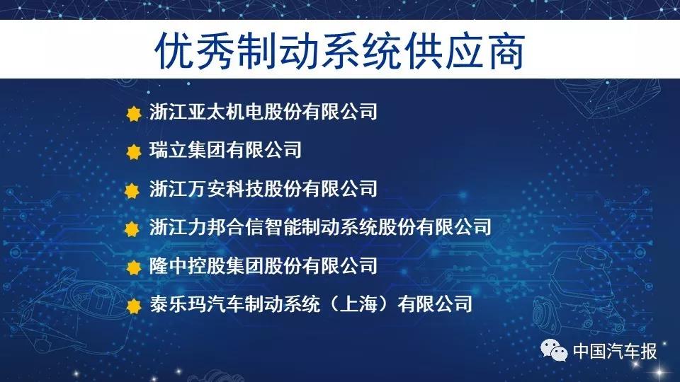 在激动热烈的颁奖环节,隆中最终荣获“优秀制动系统供应商”称号。本届百家活动受到了汽车行业、整车企业、媒体的高度关注,同时得到众多业内专家学者的大力支持,汽车零部件企业的积极参与。经过数月的层层推荐、筛选和评审,最终共有100家一级汽车零部件企业都荣获奖项。隆中控股能荣获这个奖项,正是对我司在商用车制动系统方面的努力开拓与创新的肯定与激励。